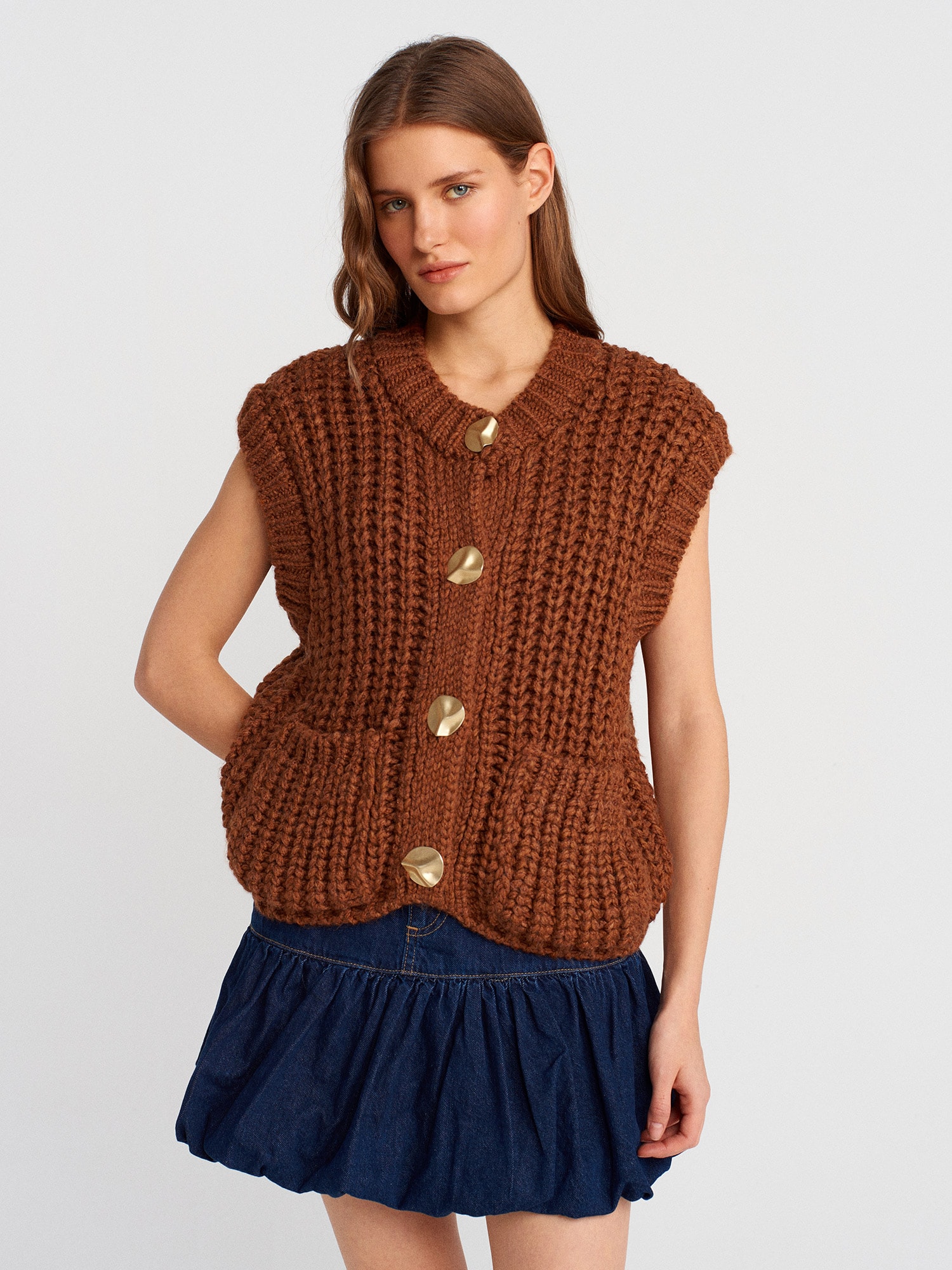 Bisiklet Yaka Buklet Cepli Düğmeli Triko Hırka Kahve